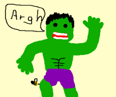 After being stung the HULKSTER began to lose control. He then began to "SMASH" anything and everything he could get his hands on. First he leveled the village that Mr. Schwartzenhoffer resided.