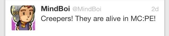 Qazfdsa wrote: I would like to announce that Aron (@Mindboi) says it is confirmed creepers will be in the next MC:PE update.