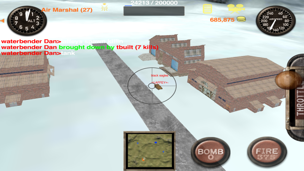 After some hide and seek around the buildings, I finally kill Laffey. He respawns at the same airport right in front of me, so I throttle back and turn a slow 360. When I'm back in line, he is ahead and turning slowly. I follow him until he flies back across the runway, and shoot him down.