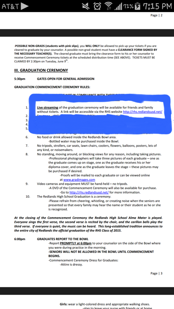 "Live streaming of the graduation ceremony will be accessible for FRIENDS AND FAMILY (you all are both). A link will be accessible via the RHS (Redlands High School) website." And if u Google Redlands high school, it should be the first one; but if by popular demand, a link is necessary, I will defiantly post one!