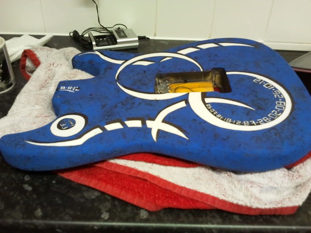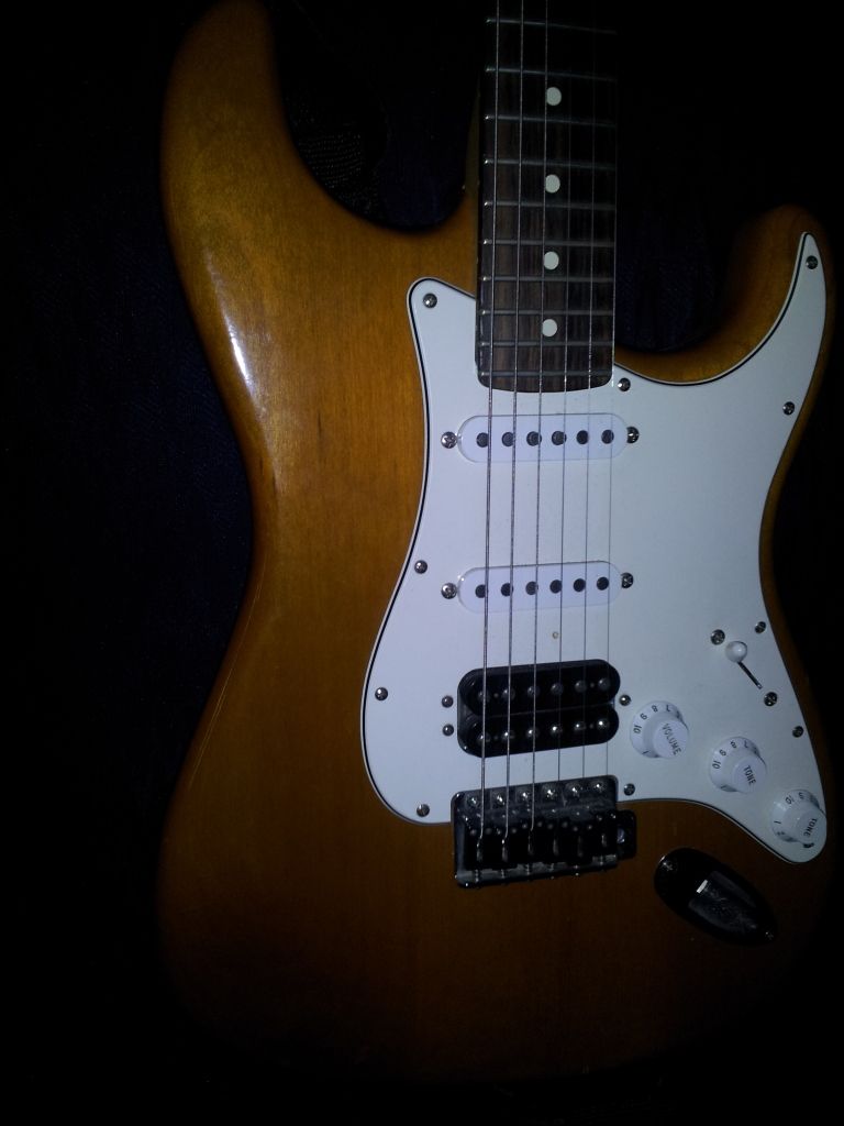 I currently have a custom strat - its a work in progress at the moment and ive chosed my artwork, locking tuners and got my main hardware. Im going with.black and then im getting me, my girlfriend and my kids put on the back in a black/white clear vinyl (see queen - bohemian rhapsody video - that kind of thing.) Ive named it "familia ante omnia" whitch means family for eternity in latin. Ive got a couple of bits still to get (its routed for any pickups i want) and those are a nice chuncky black leather strap - new scratchplate (depending on pickups) and the pickups and 500k pots. im looking at the irongear hammerhead humbucker (bridge) and an irongear jailhouse rail (single coil sized blade humbucker for mid & neck) as i loe metal but also love the yngwei malsteen style solo work. (the bridge is big output for heavy work and the blade rails are a lighter almost thrashy metal - early metallica when distorted vibe) so thats where im at - please feel free to comment or add your own projects / guitars n stuff. so grab a chair n il get the jack daniels flowin'.
