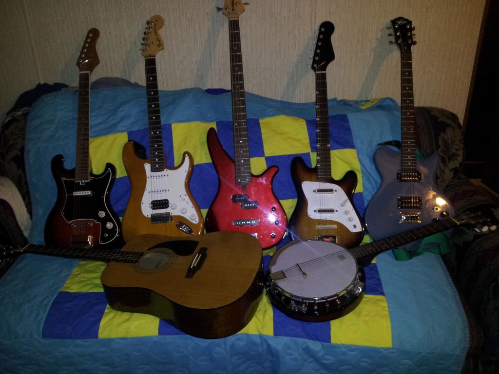 OK I have been playing for 16 years and in that time I have acquired a few guitars (probably too many since I never sell anything) I'll try to list them chronologically. Epiphone PR-100 acoustic, Squire Strat, Santa Rosa 6-string banjo, '03 Fender Highway 1 HSS Strat(made in USA), New York Pro mini acoustic, Owcar Schmidt of some kind, an acoustic that I can't remember the name of, a 1960s Japanese Mayfair, 2 unnamed 60s Jap guitars, a Yamaha bass, and a few other stringed instruments that I can't think of at the moment. I also have quite a few "blanks" that I started building in my shed. Hopefully within the next few years I will be manufacturing guitars outta the shed, I have the equipment and know how, just need the time.
